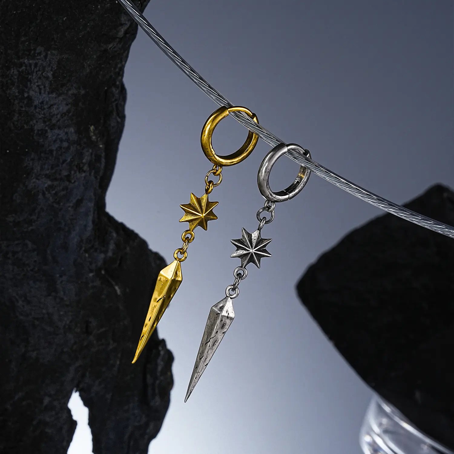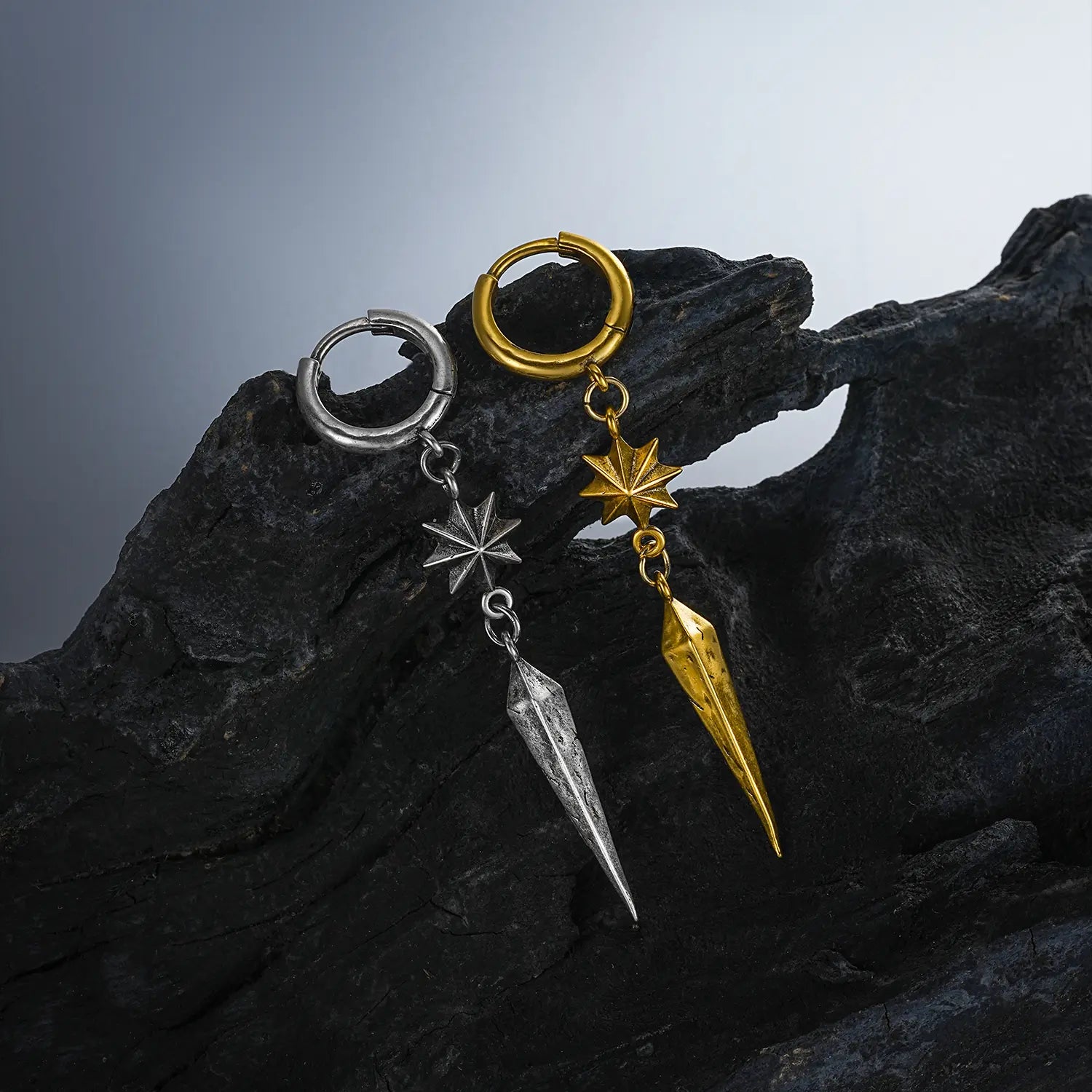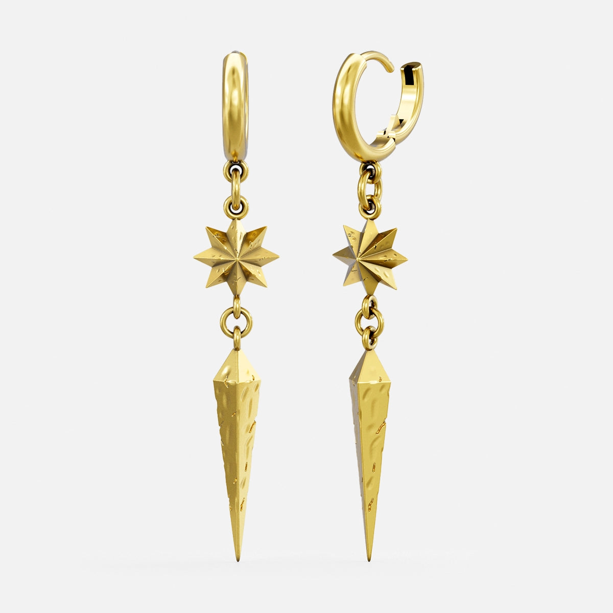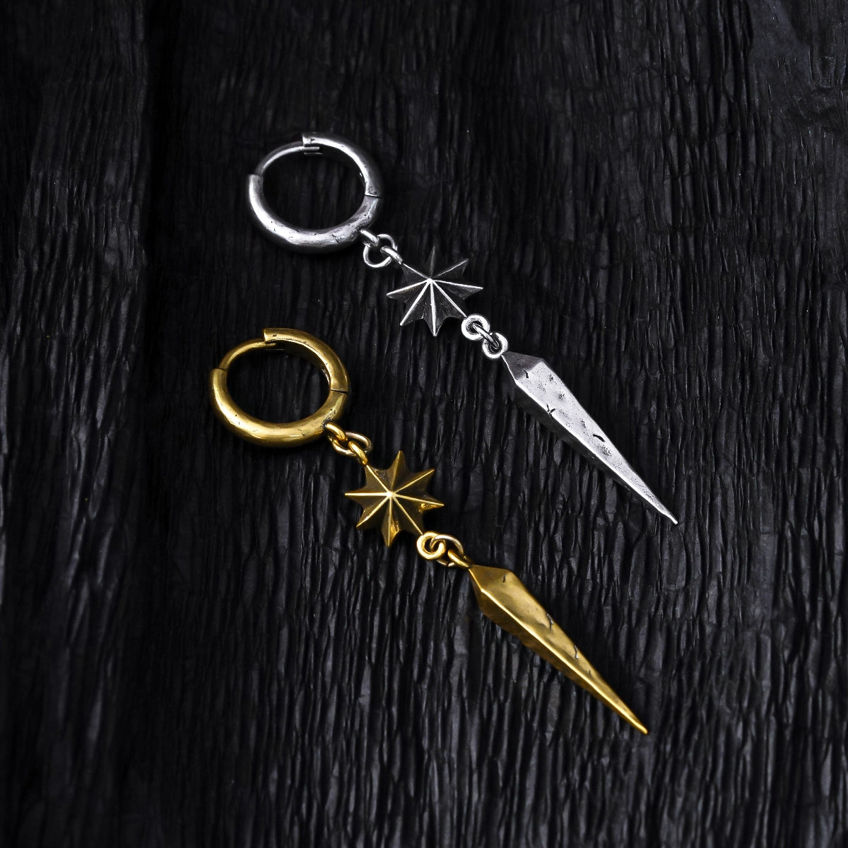 Featuring sharp geometric lines and an eight-pointed star shape, these earrings are unique and modern. This item is sold as a pair.