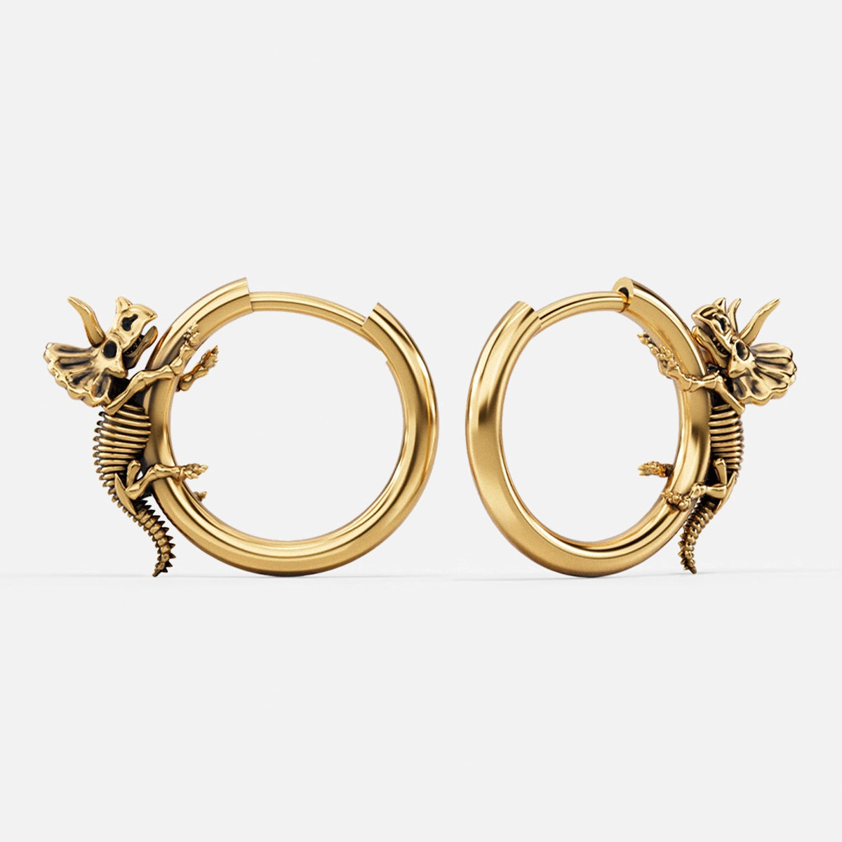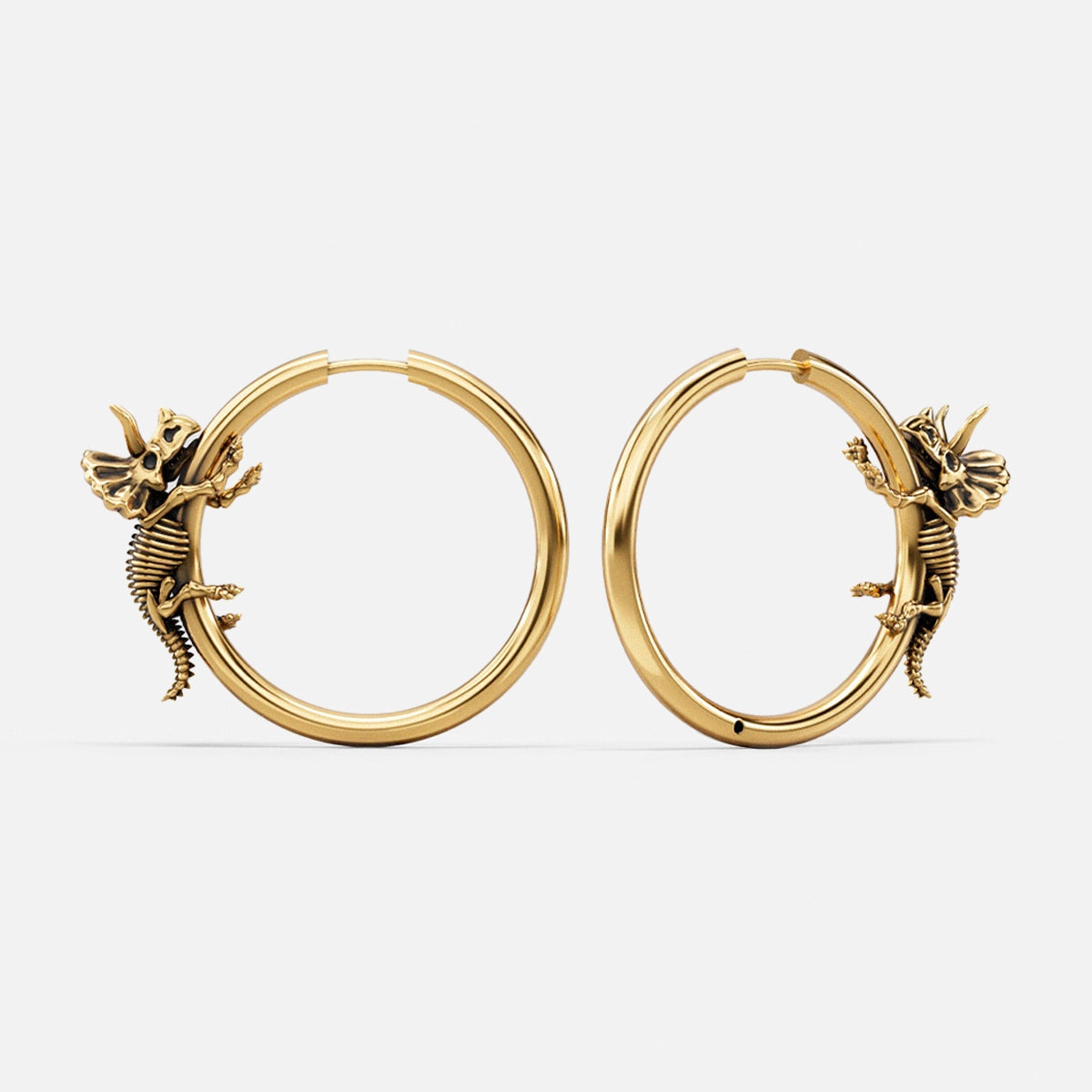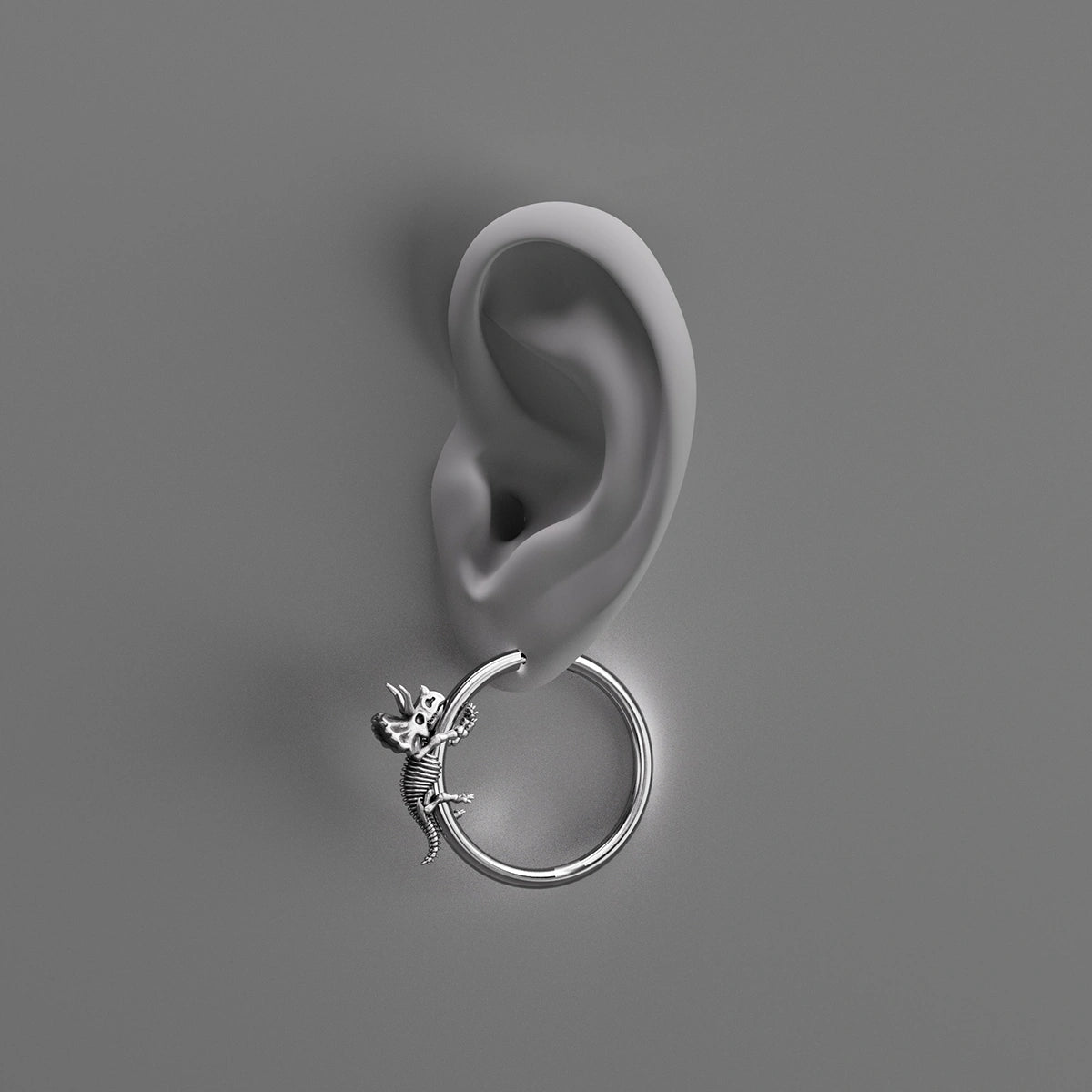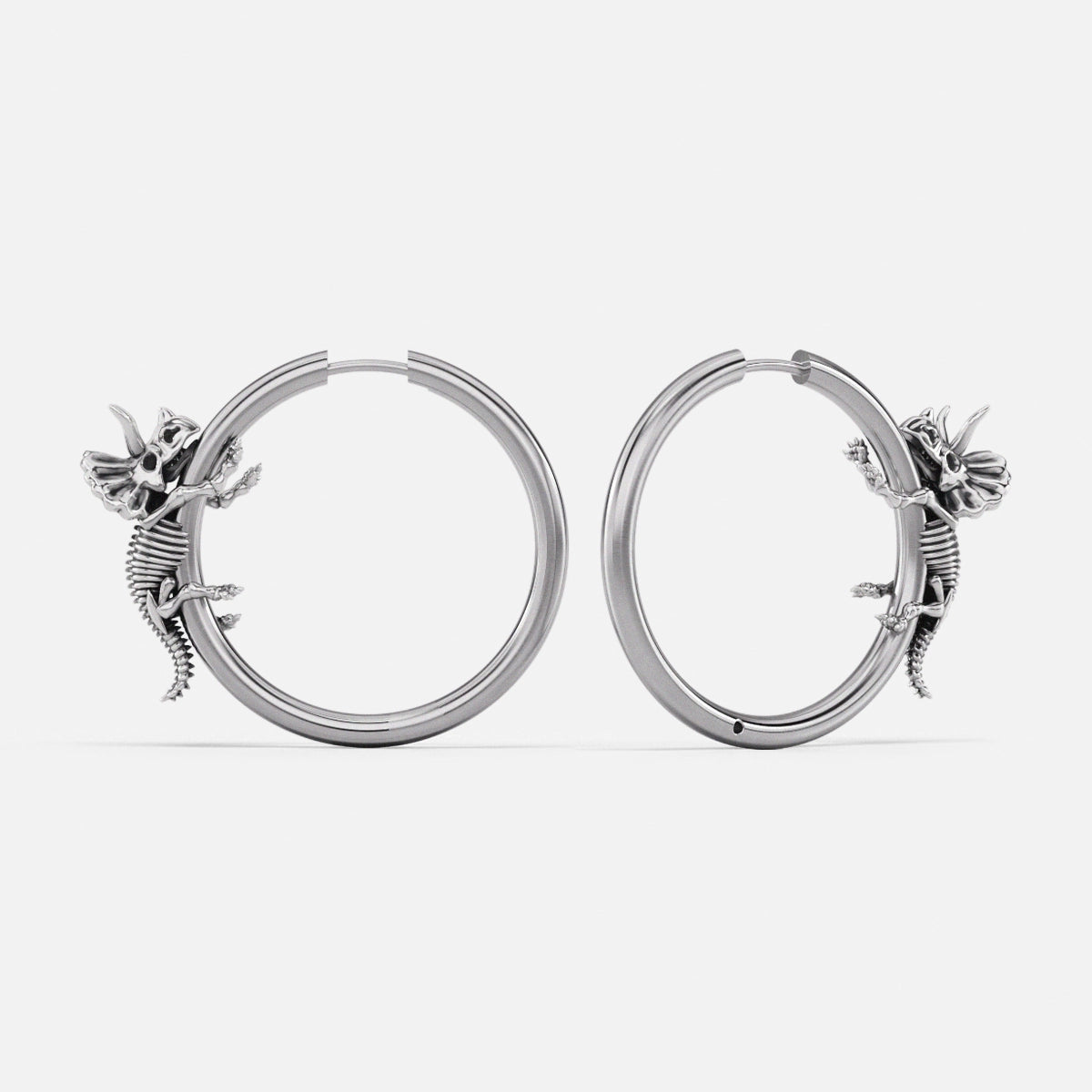 The earrings feature a striking combination of dinosaur skeleton and frilled lizard, blending ancient and modern elements into a unique and intricate design.This item is sold as a pair.
