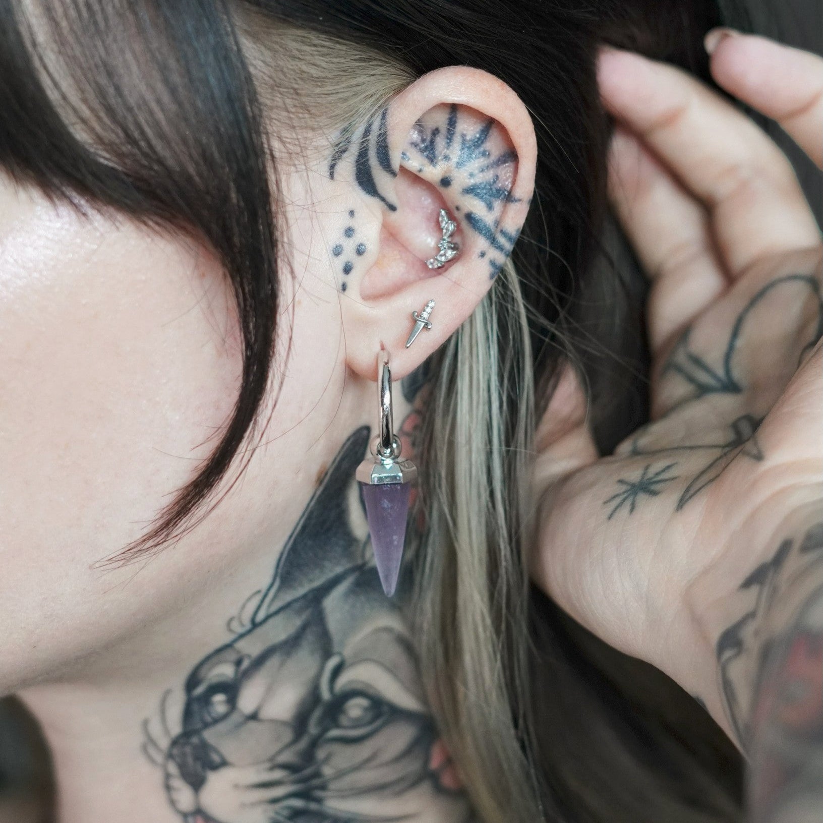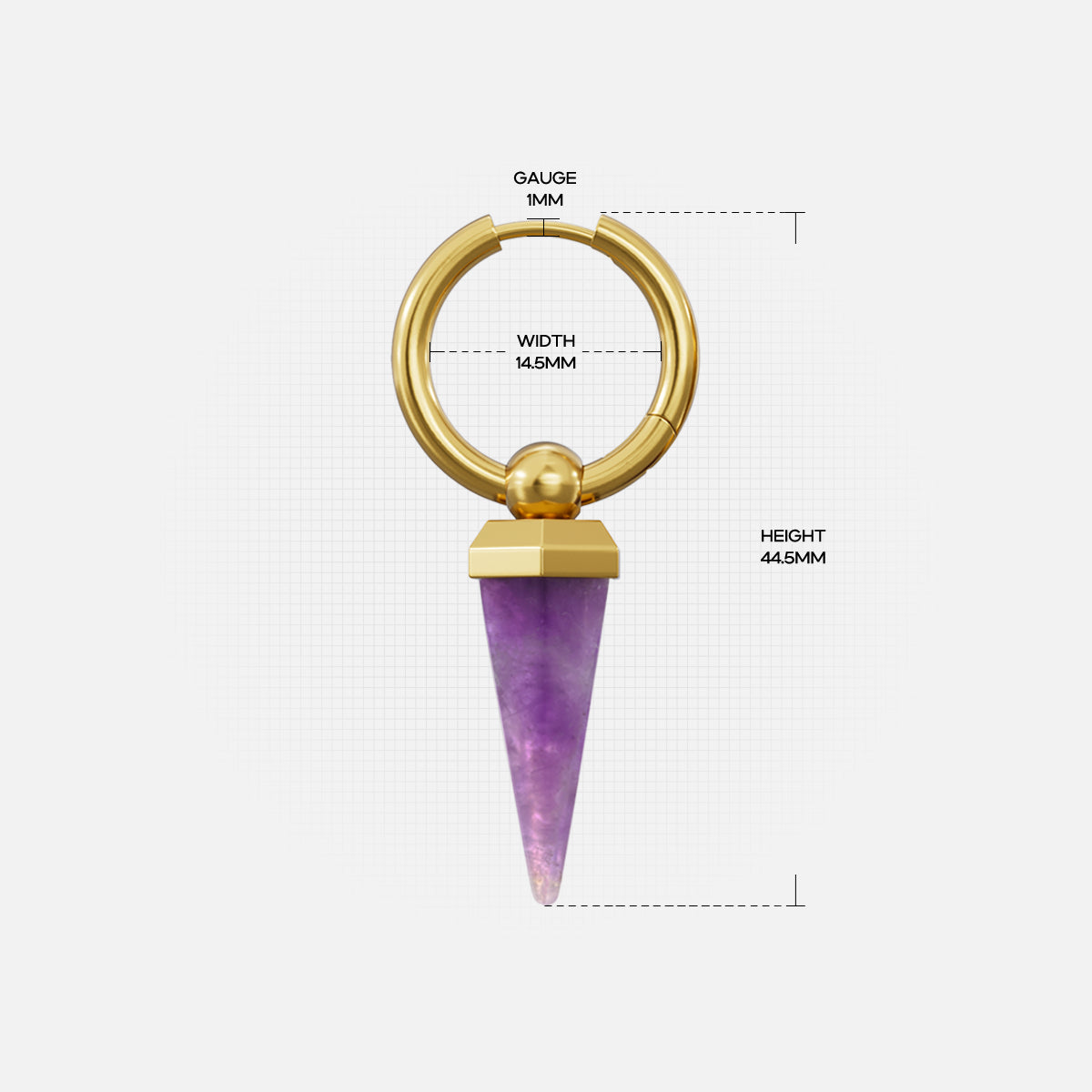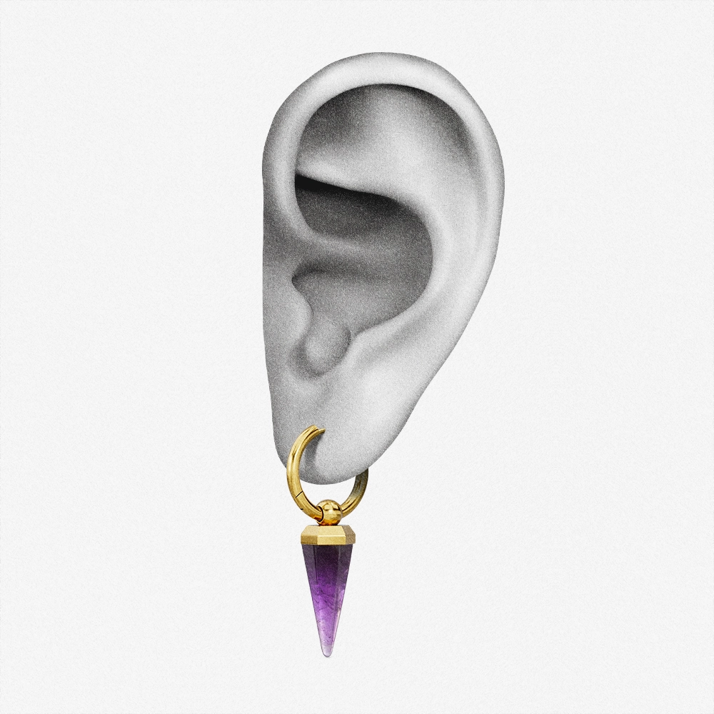 This earring features a unique amethyst shape, combining geometric design with natural elements, showcasing a perfect balance of elegance and individuality. This item is sold as a pair.