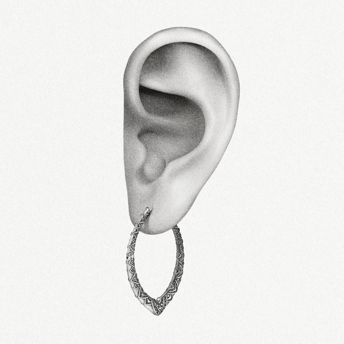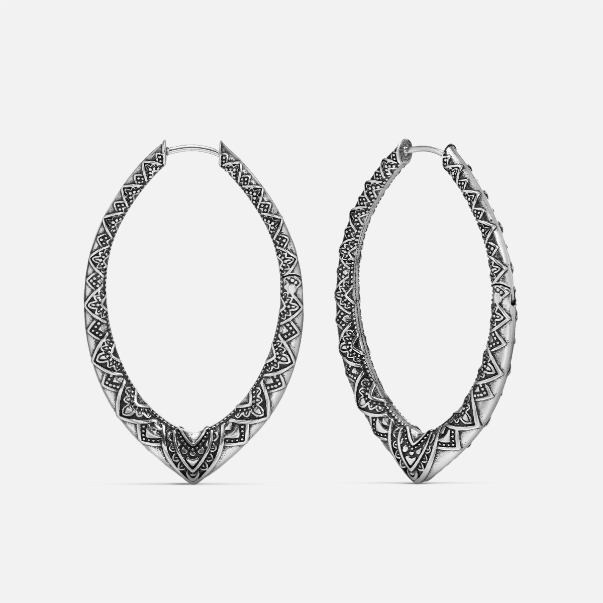 This earring features a unique oval shape with intricate geometric patterns, showcasing elegance and modernity, perfect for any occasion. This item is sold as a pair.
