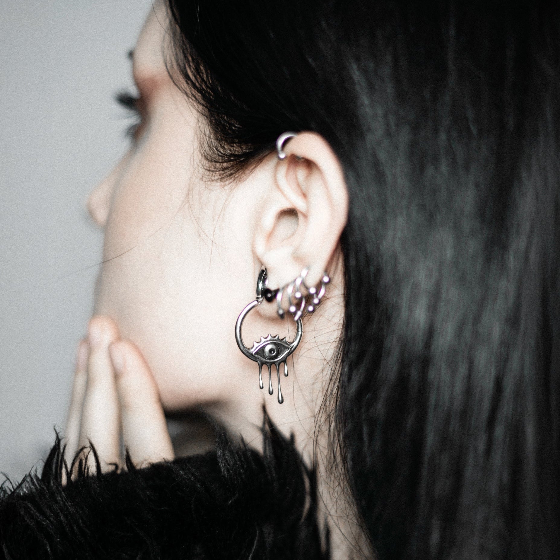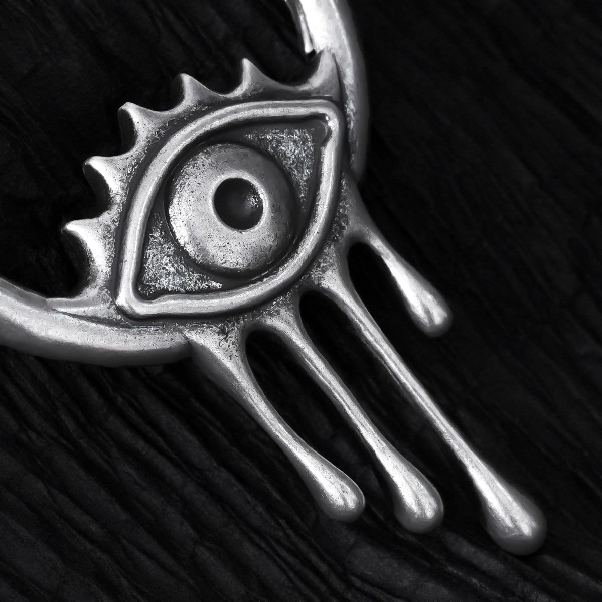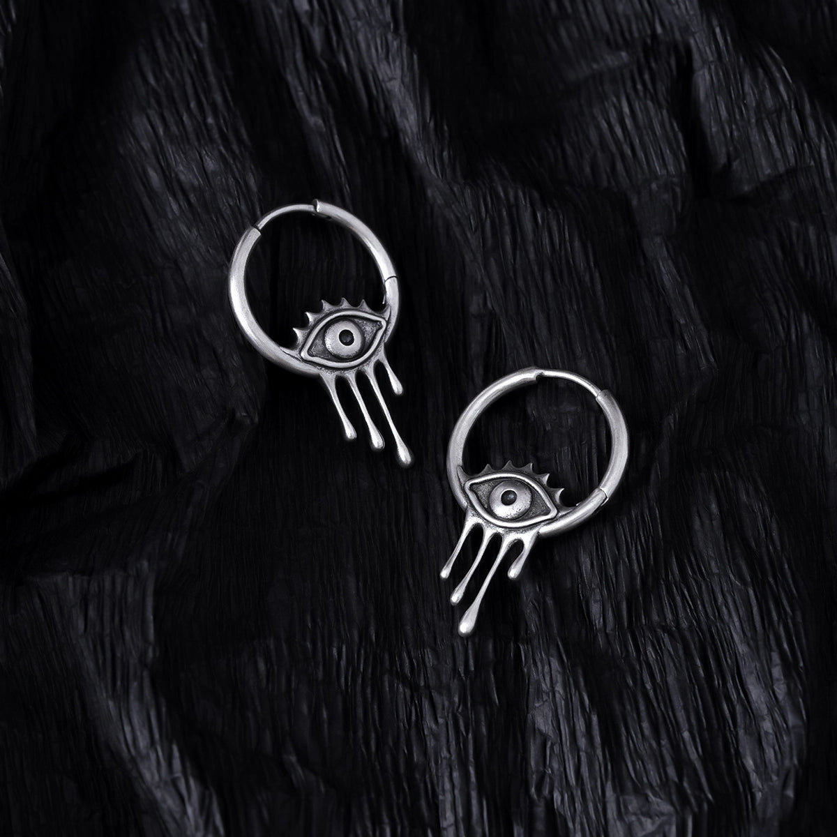 Earrings with a surreal design, featuring an eye motif and delicate teardrop elements, offer an artistic and emotive statement. This item is sold as a pair.